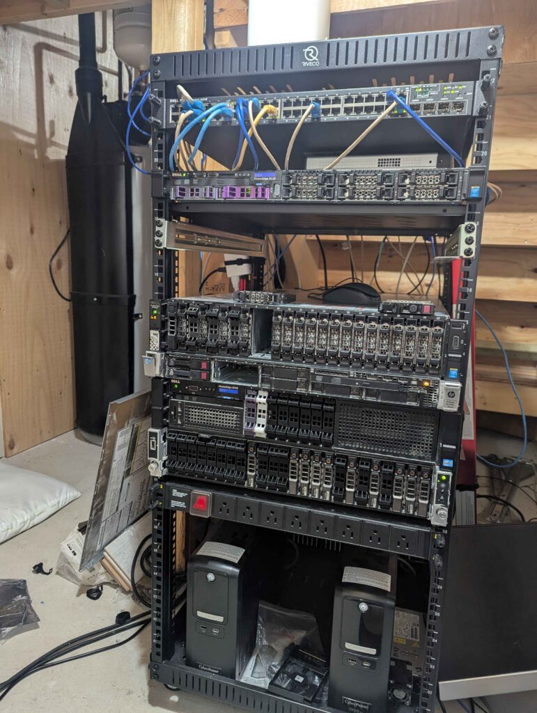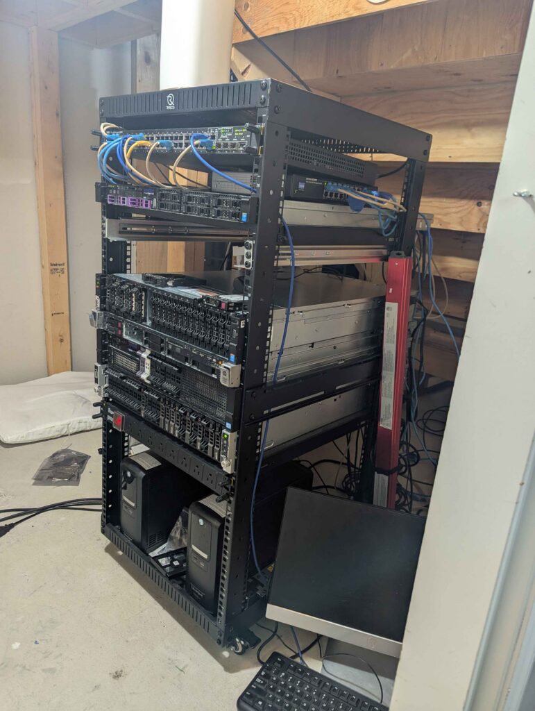 In its current iteration, my home lab is comprised of fully recycled equipment, apart from the rack its self and the two UPS’s. (I will be redoing my cable management soon)